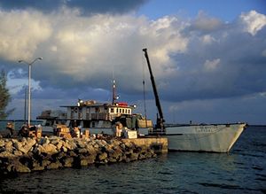 | If you choose to start this trip from Georgetown, as we did, be prepared for surf landings, tide rips and breaking waves along the exposed coast. Be prepared to go up to a mile offshore to avoid some difficult spots. The reefs and breaking waves between Flamingo Bay and Rollieville can be particularly obnoxious.We found a calm landing for our first nights camp at Ocean Bight on the south side of Saltpond Point, not a very scenic or pristine spot, but safe. Earlier in the day we had stopped for lunch near Hoopers Bay. The surf there was deceptively powerful. After launching my partner, it took me a half-hour and all my strength (and some luck) to get off the beach. It would have been smarter had we lunched at sea! | ![]() |