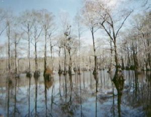 What We SawIt's flat. No whitewater here. This is a POND for Pete's sake. Actually, it's a pretty big pond. You don't notice the size, because it is filled with cypress trees. Sometimes they are in clumps, and sometimes they are stick out alone. The "pond" is a shallow U shape, about 2 miles up the legs and 3 miles at the base. They don't allow any gasoline motors at all on the pond, which is a state park. You enter at the NW end of the U, at a boat ramp where they also rent canoes (Old Town Discovery 158 I think). You can paddle out along a set of buoys to the "family campground" and camp there, or you can go to a "drive in" type of campground a couple of miles from the boat ramp. Farther on there is a set of white (the map says they are yellow -- maybe they were at one time) buoys that mark the direction to the "group campground," where they make boy scouts and church groups and the like stay. Now you're about halfway down the first leg of the U. No more buoys or stuff. In fact, there are so many "landmarks" that you can get confused. None of that remembering that tree in the water stuff. There are literally hundreds of them. Even a pretty cheap compass can keep you from going in circles. Anyway, as you get on down towards the bottom of the U the "landscape" changes a bit, to where there are more wide open spaces it seems. Then as you climb up the other leg of the U, you head into more a swamp, following a path (creek) through it. Merchants Millpond is in NE North Carolina, and is formed by the damming of Bennet's Creek, right where the boat ramp is. I have no idea what the history of the place is, but geologically it is supposed to be an extension of The Great Dismal Swamp, to the NE. There is a run down Bennet's Creek to Chowan River that starts at Merchants Millpond (below the spillway) that is supposed to take some 5 hrs to the take out, if you want some fairly easy river stuff. Upstream is the Millpond, which like I say, is quite large. The water is often shallow, like 2-3 ft (less closer to "land") and slowly backs up until you are in Lassiter Swamp, which is what Merchants Millpond turns into and Bennet's Creek flows through. |