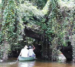 fish and wildlife it once had. We saw an alligator as the stream narrowed. And we understand that manatees sometimes work their way up the river to enjoy the safe harbor of the no-wake river.. The photo at right shows another lesson in ecological damage. In several areas, you'll notice exotic (non-native) vines smothering trees. Though we enjoyed kayaking and canoeing under this tunnel of vines, it's unfortunate that these vines often kill the trees they cover. |