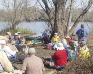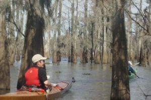 What We SawThose of us from Houston and some of the South Louisianians met at Lake Fausse Point State Park which is inside the geographic basin but just outside the manmade levee along the Atchafalaya River and camped together Friday night before meeting the rest of the group on Saturday morning. We slept to the raucous sounds of spring peepers. The put-in, Sandy Cove Landing, was only a few miles south down the levy road from the park so we ate a leisurely breakfast and broke camp. I had time take a short walk and enjoy birds, the red maples that were leafing out and sprouting violets.. We met the rest of the group around 10:00 A to run the shuttle which turned out to be only about 4 miles further south on the same levy road. A pickup served as the shuttle vehicle to haul us all back. I found myself squeezed in the back with 11 other friendly people while the driver and the the 2 luckiest passengers rode up front. But I had a fine time meeting old and new friends. (This trip had paddlers from Houston, Lafayette, Baton Rouge, and many small towns from the north side of Lake Ponchertrain.) Finally, about 11:00A, all 32 of the group were starting to put in and paddle down Fausse Point Cut. The day was just perfect, with bright sun, a light breeze and a temperature that started in the high 50's and probably reached the high 60's. I was paddling with Hulin, my oldest paddling buddy, in my tandem Winonoh Sundowner. Others were paddling in flat water solo or tandem canoes, white water canoes, sea kayaks, and even white water or down river kayaks. It was a very diverse group. The cut was wide and lined with dormant trees, including tupelo and some cypress. |